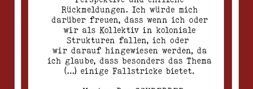 Wir haben es schon mehrfach angedeutet – hier nochmal offiziell: Wir sind Mentor*innen beim diesjährigen SCHREDDER- Festival! Der SCHREDDER ist die Spielreihe für Nachwuchstheatermacher*innen am Theaterhaus Hildesheim e.V. Bereits zum 12. Mal konnten sich verschiedene Gruppen mit ihren Konzepten und Ideen bewerben. Auch dieses Jahr haben es tolle Theaterschaffende durch das Auswahlverfahren, am Pitch-Wochenende, geschafft. In den letzten Wochen durften wir demnach drei von vier Gruppen in ihren Prozessen begleiten und dabei selbst einiges lernen. Unsere Team von Amo – Braunschweig Postkolonial e.V. hat sich dafür aufgeteilt, um möglichst viele Gruppen zu betreuen. Nach individueller Kompetenz unseres Teams konnten wir aus der Sicht von Konsument*innen, in der Rolle als Expert*innen mit dem Schwerpunkt Antirassismus, bis hin zu einer ästhetischen und künstlerischen Perspektive verschiedene Positionen einnehmen und die jeweiligen Teams unterstützen. In den letzten Wochen könnten wir begeistert die Testläufe mitverfolgen.Das Online SCHREDDER-Festival wird vom 23.04.2021 bis zum 30.04.2021 stattfinden. Um die Arbeit des Theaternachwuchsformat zu unterstützen werden Spenden gerne gesehen. Weitere Infos findet ihr auf den Kanälen vom SCHREDDER!